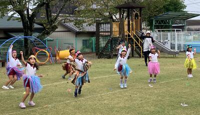 袋井東幼稚園では、運動会を〝親子で楽しく心と体を動かして遊ぶ会〟とおさえ、子どもたちが元気いっぱい走ったり、友達と協力して表現したりすることだけでなく、親子のふれ合いを大切にし、体を動かして遊ぶ楽しさを味わってほしいと考えています。子どもたちの興味や思いを活かし、園児とその家族がみんなで楽しめそうな内容を検討しながら進め、当日を迎えました。