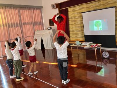 今回、ハローイングリッシュでは、英語を学ぶというより遊びを通してしぜんと英語に触れる・知る・慣れるという内容で進めてくださり、子どもたちは目を輝かせながら喜んで参加することができました。英語は生活の中でよく耳にする言語ですが、来年小学生になる年長児が少しでも英語に興味が膨らむといいなと感じました。