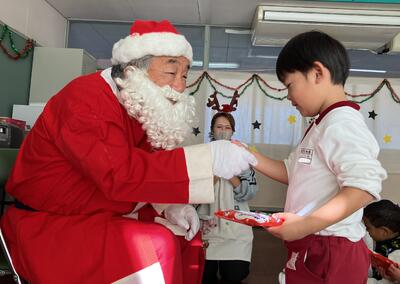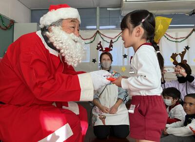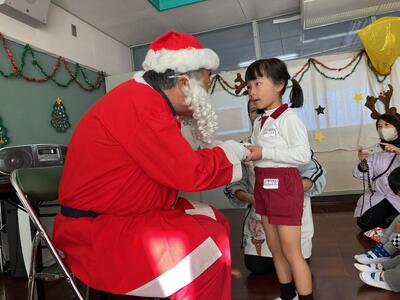 そして、子どもたちが待ちに待っていたプレゼントタイムへ…。白い布袋に入ったプレゼントを一人一人に手渡してくれました。サンタさんの目の前へ行くと緊張してしまう子もいましたが、プレゼントをもらって握手をし、『ありがとう』とお礼の言葉を伝えることができました。