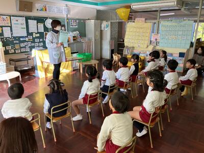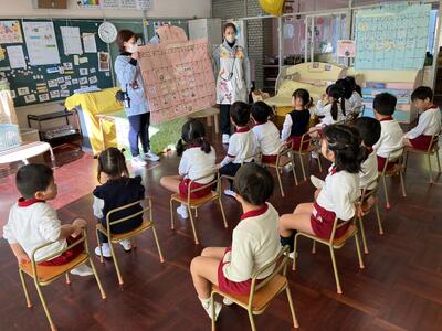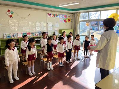 式では、子どもたちと一緒に2学期を振り返り、楽しかったことを共有したり頑張ったことを認めたりしました。まだまだ暑かった9月の水遊びから始まり、遊ぼう会(運動会)や虫探し、園外保育や表現遊びなど、楽しいことが盛りだくさんの充実した2学期になりました。遊びや生活の中で考えたり学んだりした経験は子どもたちの力となっていることと思います。