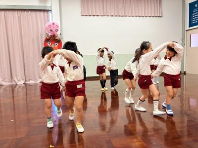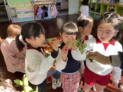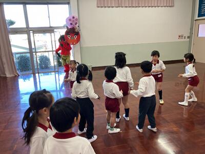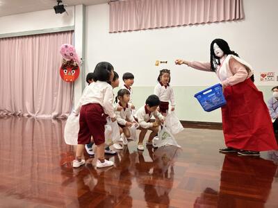 用意しておいたイワシの頭や柊を保育室の出入り口に飾り、豆まき会を行う遊戯室へ。遊戯室では、紙芝居を用いて節分について知りました。さらに、『♬まめまき』を歌ったり、『🎵マメまきたいそう』や『♪赤鬼と青鬼のタンゴ』を踊ったりして豆まき会を楽しんでいると、遠くから太鼓のドーンドーンという音が…。