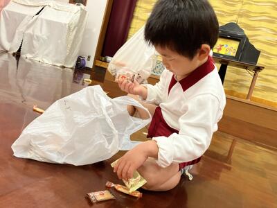 その後は子どもたちが楽しみにしていた福(お菓子)まき。福の神様がたくさんの福を持ってきてくれたので子どもたちは大喜び!夢中になって拾っていました。拾い終えると、袋にたっぷり入ったお菓子を自慢げに見せ合い大満足の様子でした。